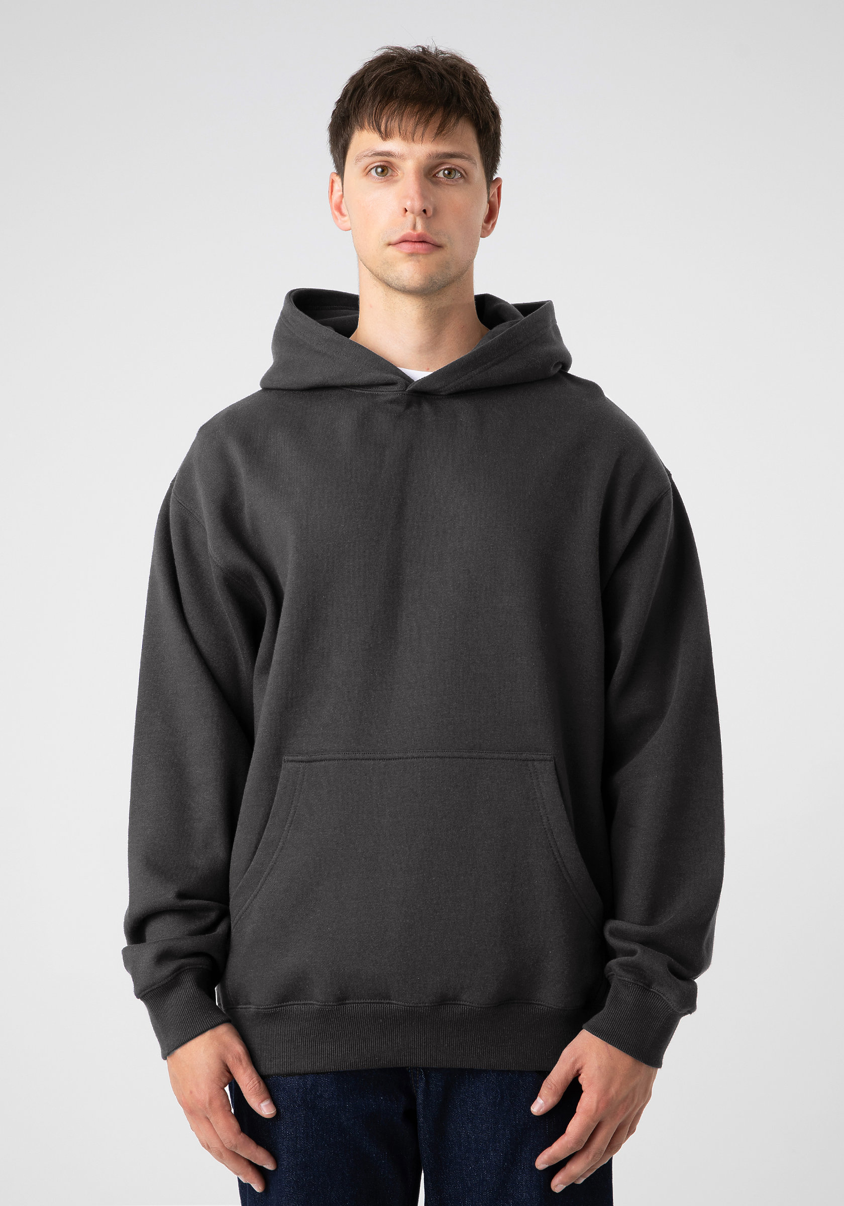Oversized relaxed fit, drop shoulder, no drawcord, set-in sleeve, double layered hood in self fabric, overlapped neckline, inside single jersey back neck tape, self fabric half moon at back neck, side-seamed, 1x1 reinforced ribbed cuffs and waistband. Tightly knit, ultra soft hand, superior printability, great for discharging.